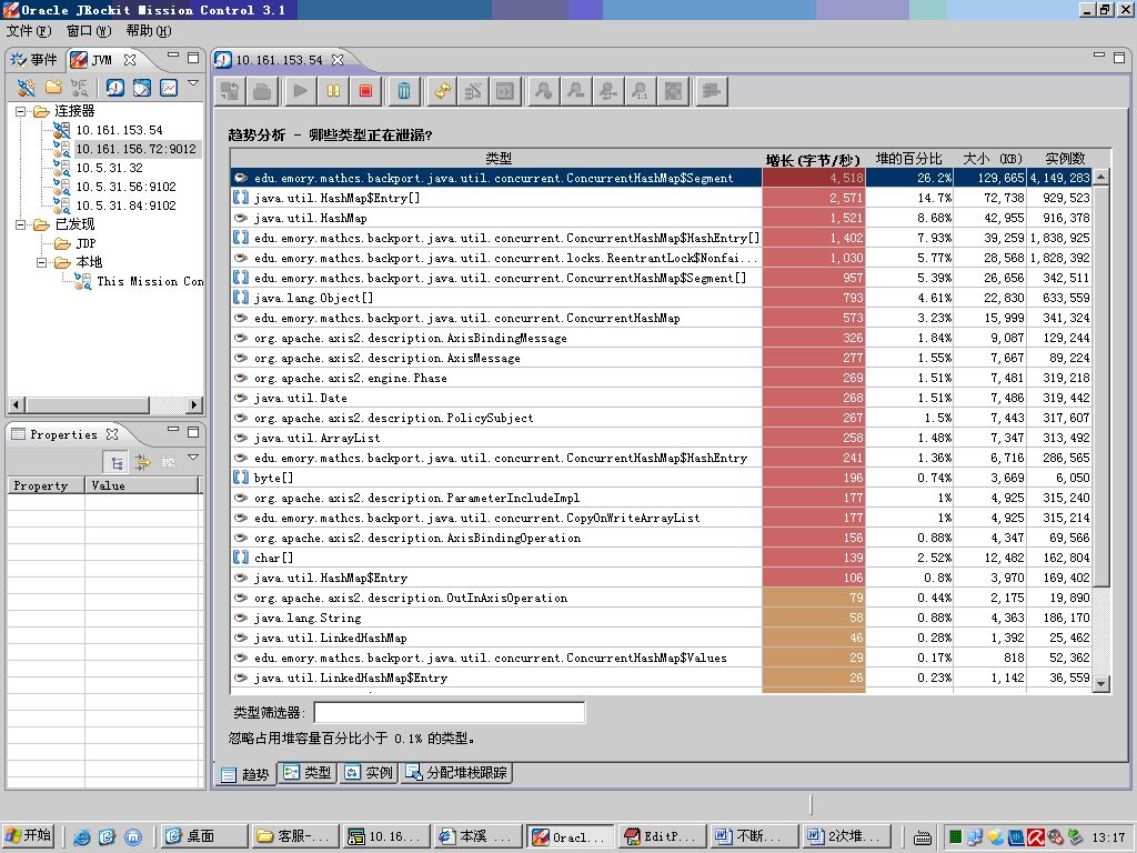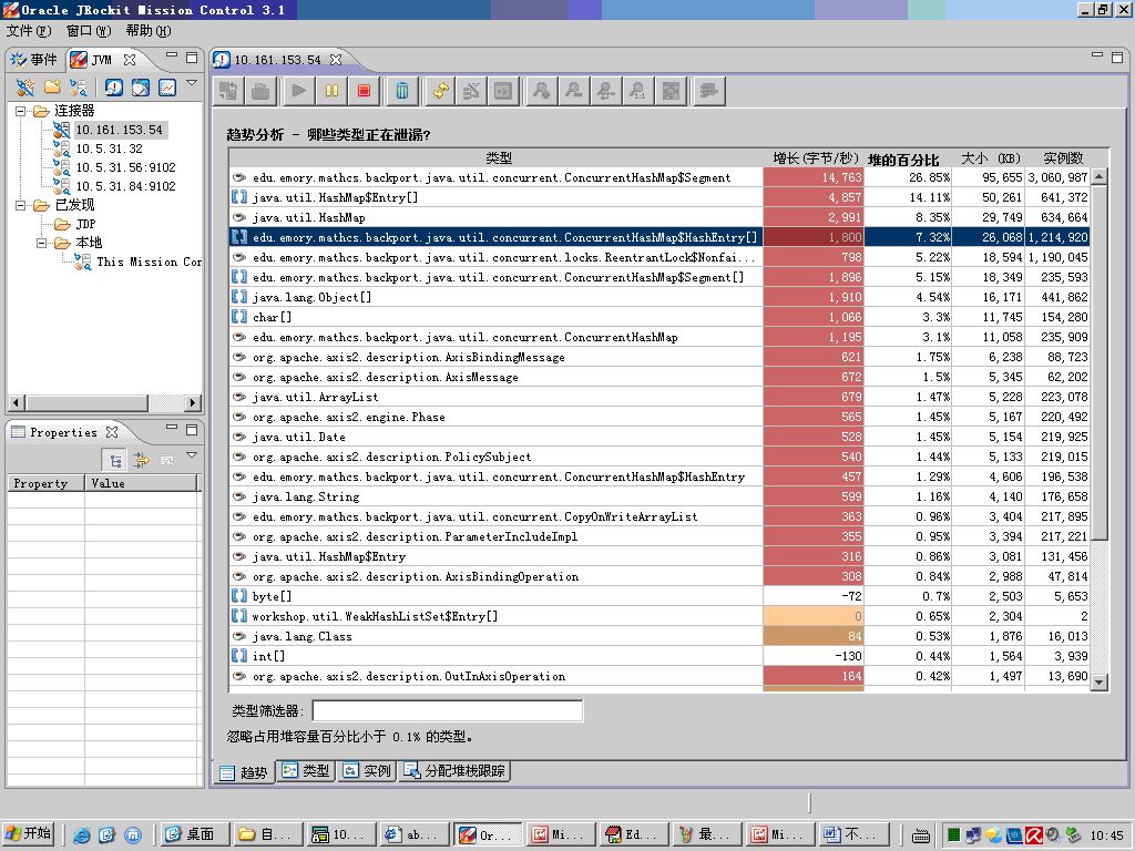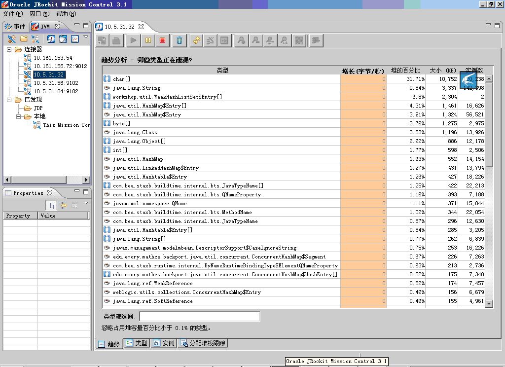 最先看见的是“趋势”选项卡,里边标注了占用JAVA堆大于0.1%的类和数组。