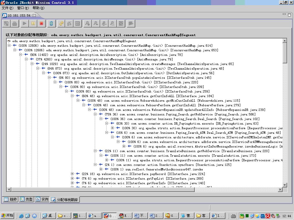 知道是那个类出了问题,然后就需要知道系统中都那些类使用了这个问题。在edu.emory.mathcs.java.util.concurrent.ConcurrentHashMap$Segment上右键,选择“显示分配跟踪”,进入“分配堆栈跟踪”选项卡,
