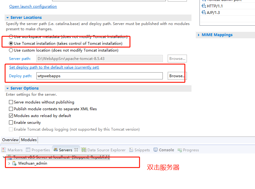 3.双击那个Tomcat,会打开属性面板,找到左边第二个Server Locations。