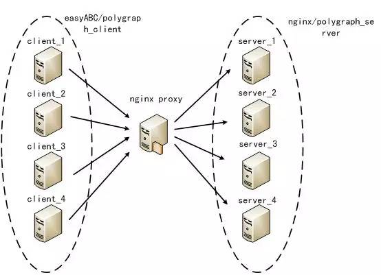 polygraph提供Client端和Server端,将测试目标nginx放在二者之间,三者之间的网络交互均走http协议,只需配置ip+port即可。