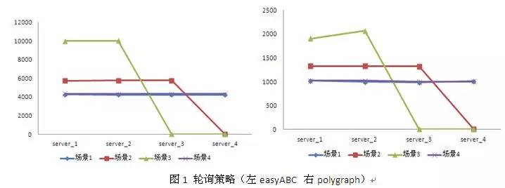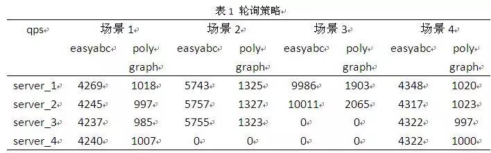 另外,考虑到测试工具自身的特点,在easyabc上的测试压力在17000左右,polygraph上的测试压力在4000左右。以上测试均保证被测试对象可以正常工作,且无任何notice级别以上(alert/error/warn)的日志出现,在每个场景中记录下server_*的qps用于最后的策略分析。