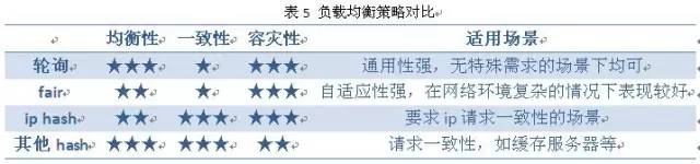 通过实际的对比测试,我们对nginx各个负载均衡策略进行了验证。下面从均衡性、一致性、容灾性以及适用场景等角度对比各种策略。如下图示: