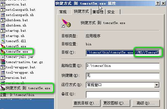 如果是解压缩版,那么自己建立一个 tomcat5w.exe或者tomcat6w.exe的快捷方式,并修改启动参数,注意后面的为服务名字,也就是你用service.bat设置的名字。比如